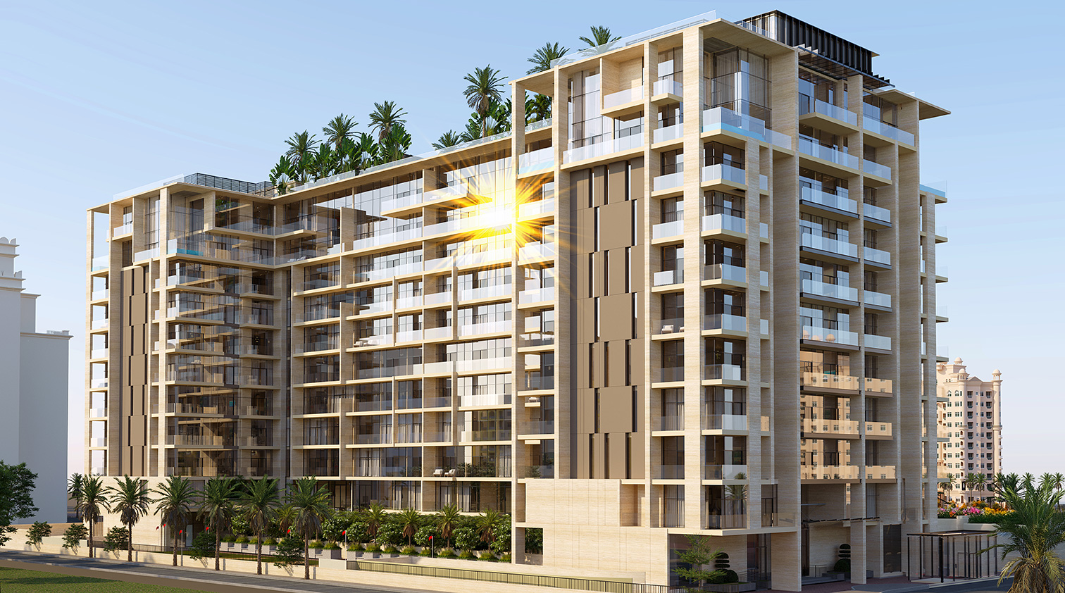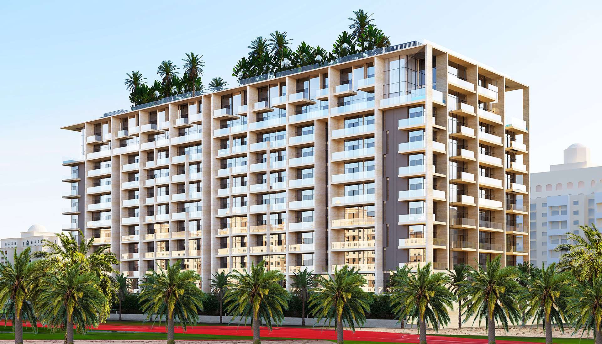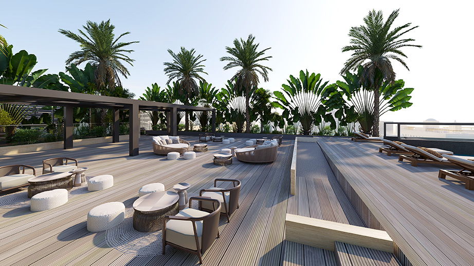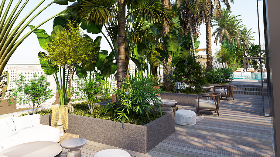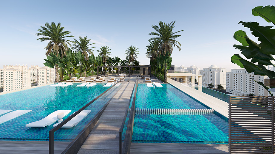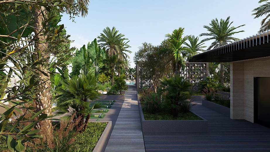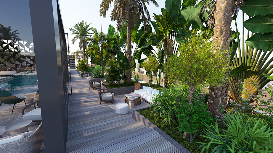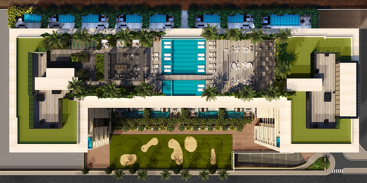 Photo gallery of exterior rendering shots including the building view and external amenities.